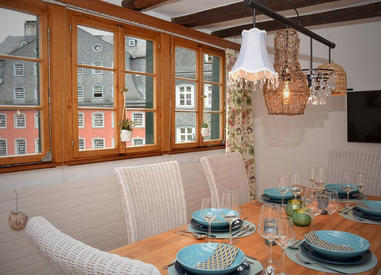 Sie haben einen direkten Blick auf das Rote Haus und auch auf die imposante Burg oberhalb Monschaus.